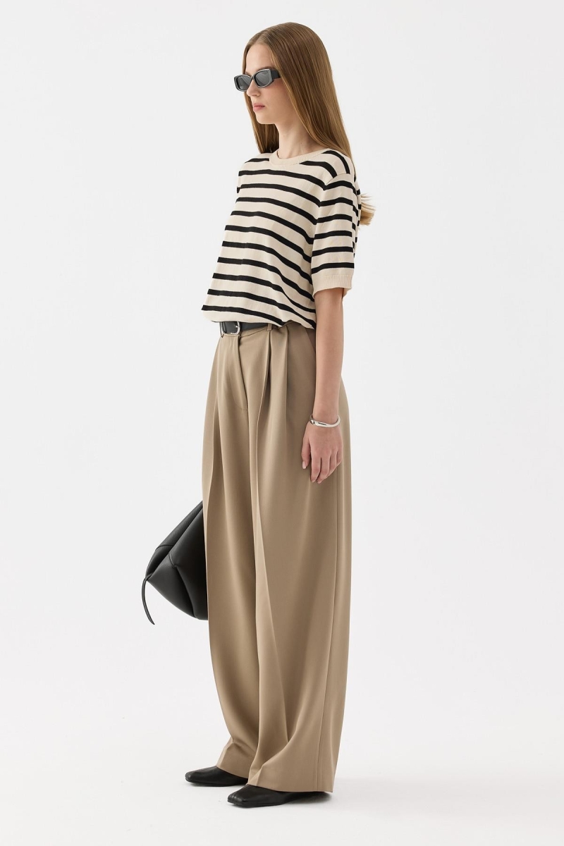 Mad. Pantolon, modern çizgileri ve sade şıklığıyla gardırobunuzun vazgeçilmez parçası olmaya aday. Yüksek bel tasarımı ve dökümlü yapısı sayesinde hem rahat bir kullanım sunar hem de zarif bir siluet oluşturur. Ofisten günlük kullanıma kadar pek çok farklı stile kolayca uyum sağlar.