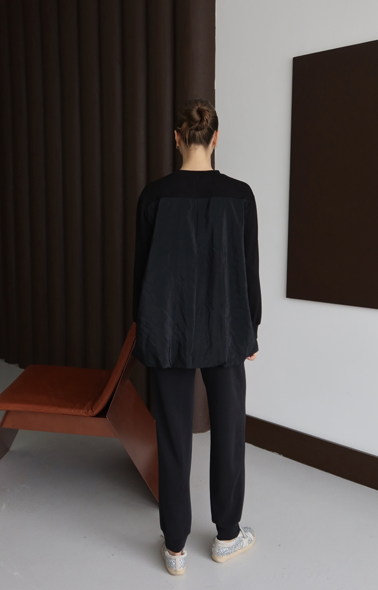 Bu kadın oversize casual sweatshirt, üst kısmı pamuklu kumaş, alt kısmı ise parachute (paraşüt) kumaş detaylı modern tasarımıyla dikkat çeker. Rahat kesimi, hafif yapısı ve şık dokusu sayesinde hem günlük kombinlerde hem de spor–casual tarzda kolayca kullanılabilir. Göğüs kısmındaki kapak cep detayları ürüne farklı ve modern bir görünüm katarken, siyah rengiyle her parçayla uyum sağlar.